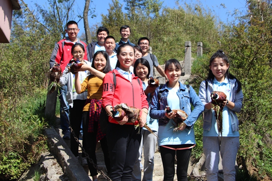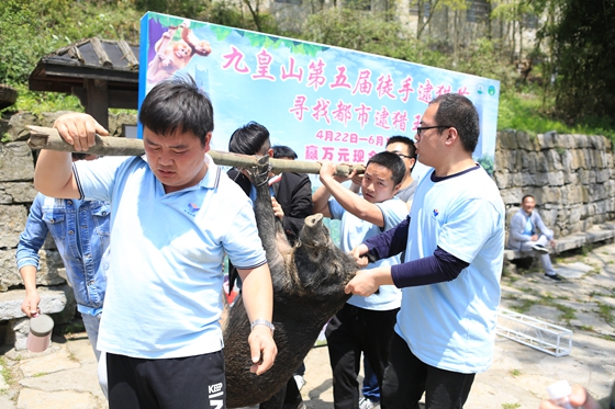 4月29日一早大家便开启了九黄山之旅,体验了登山、滑草、狩猎等特色项目。一路上大伙儿热情高涨,认真体会大自然带给我们发自内心的喜悦,山间不时传来合唱的歌声,仿佛回到了无忧无虑的童年。经过2小时的辛勤攀登,挥洒着汗水,抵达后山滑草场,大家有的抓野鸡,有的滑草,有的观看猴子和小熊表演,热闹非凡。不多时,大家便捕获了6只野鸡,得意满满的快乐慕煞过往游客!随后,大家集体前往期待已久的野生动物狩猎场,开始了惊险刺激的徒手抓野猪活动。莽莽丛林,荆棘密布,万余亩的茫茫大山,挡不住我们30多位须眉巾帼的豪情壮志,漫山遍野回荡着小伙子姑娘们的呐喊声欢呼声。终于,大家通过层层堵截、包围,甚至叠罗汉的方式,成功捕获了一头重达118斤的黑毛野猪----最佳战利品,也是该狩猎场开春以来唯一游客徒手捕获的野猪!在这个活动中,充分体现了团队协作的重要性,更展现了振通团队的勇敢、无所畏惧的英雄本色!